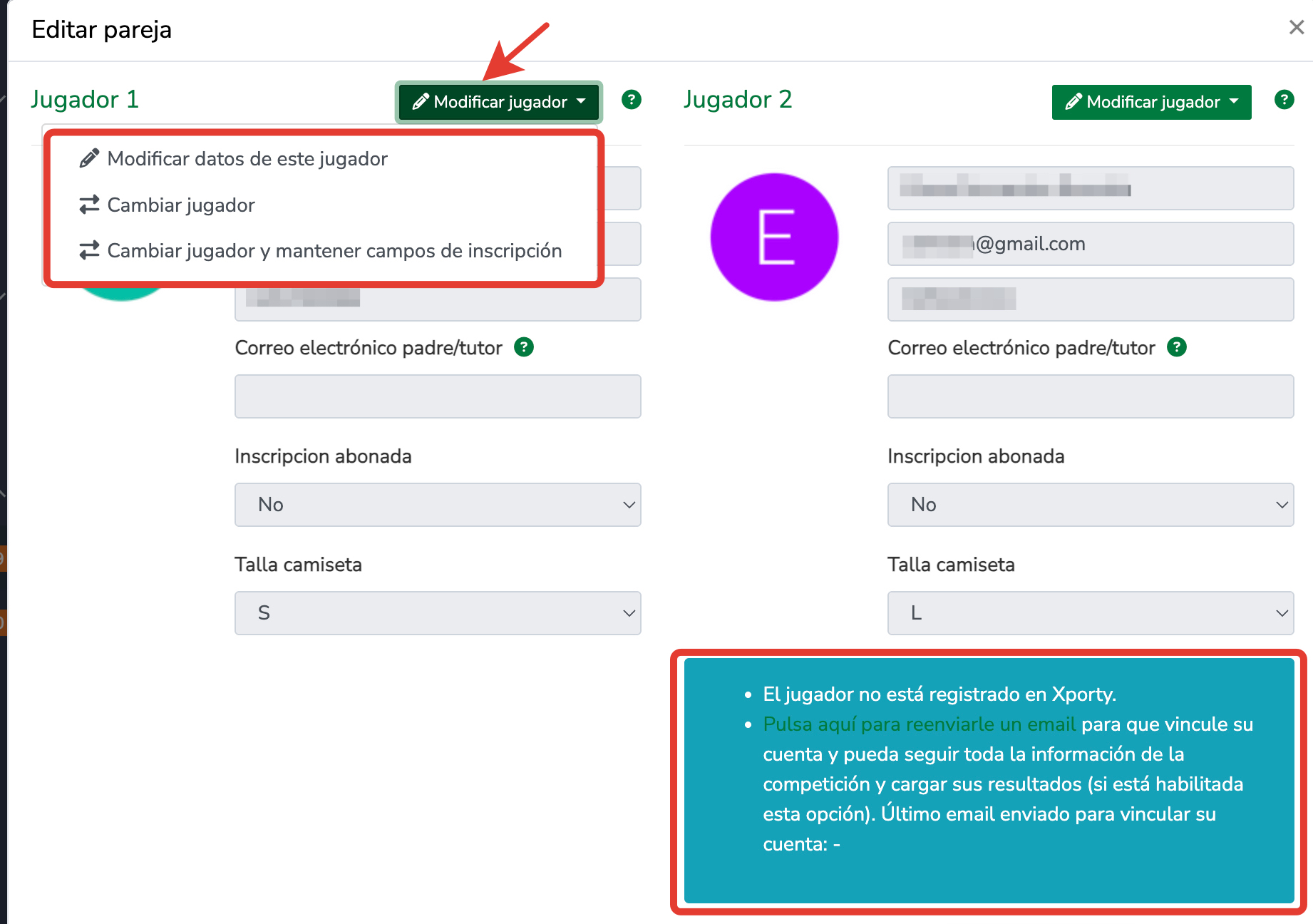 En la parte superior del detalle de inscripción, haz clic en el botón Modificar jugador. Al hacerlo, se desplegarán tres opciones: