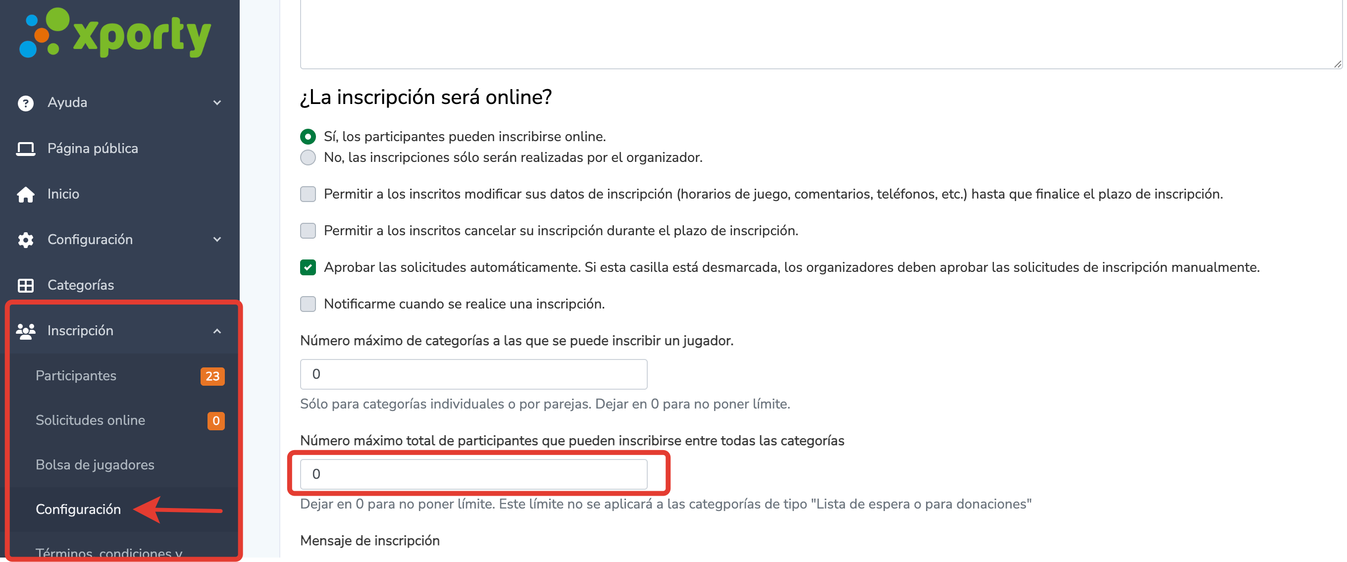 Si no quieres limitar el número de inscritos por categoría y prefieres establecer un límite general, puedes hacerlo en la página de Configuración de inscripciones, indicando el número total de participantes máximos que puedes inscribirse entre todas las categorías.
