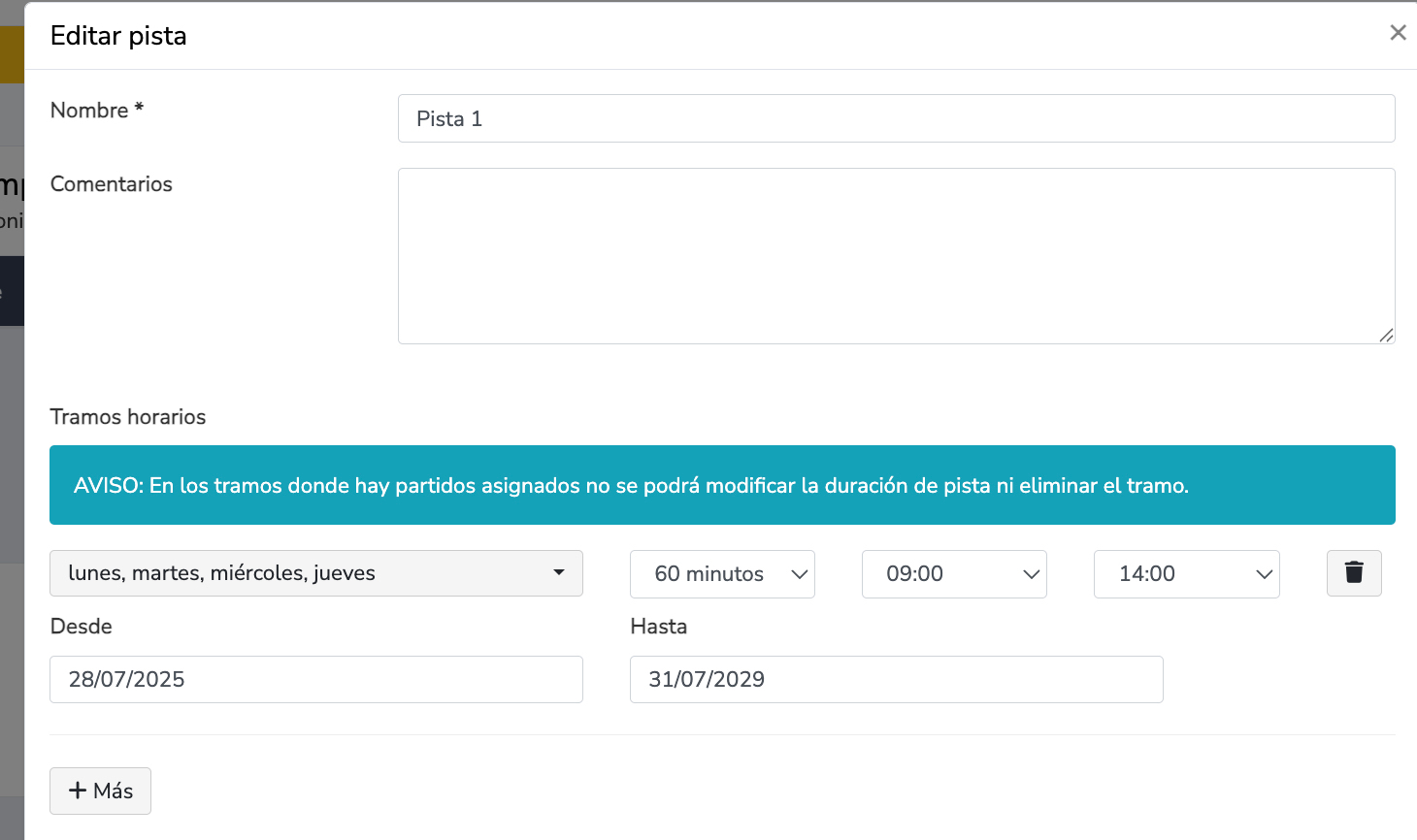 Imagina que tu pista abre de lunes a jueves de 09:00 a 14:00 (tramo horario), pero el lunes de 13:00 a 14:00 la pista está ocupada por una clase.