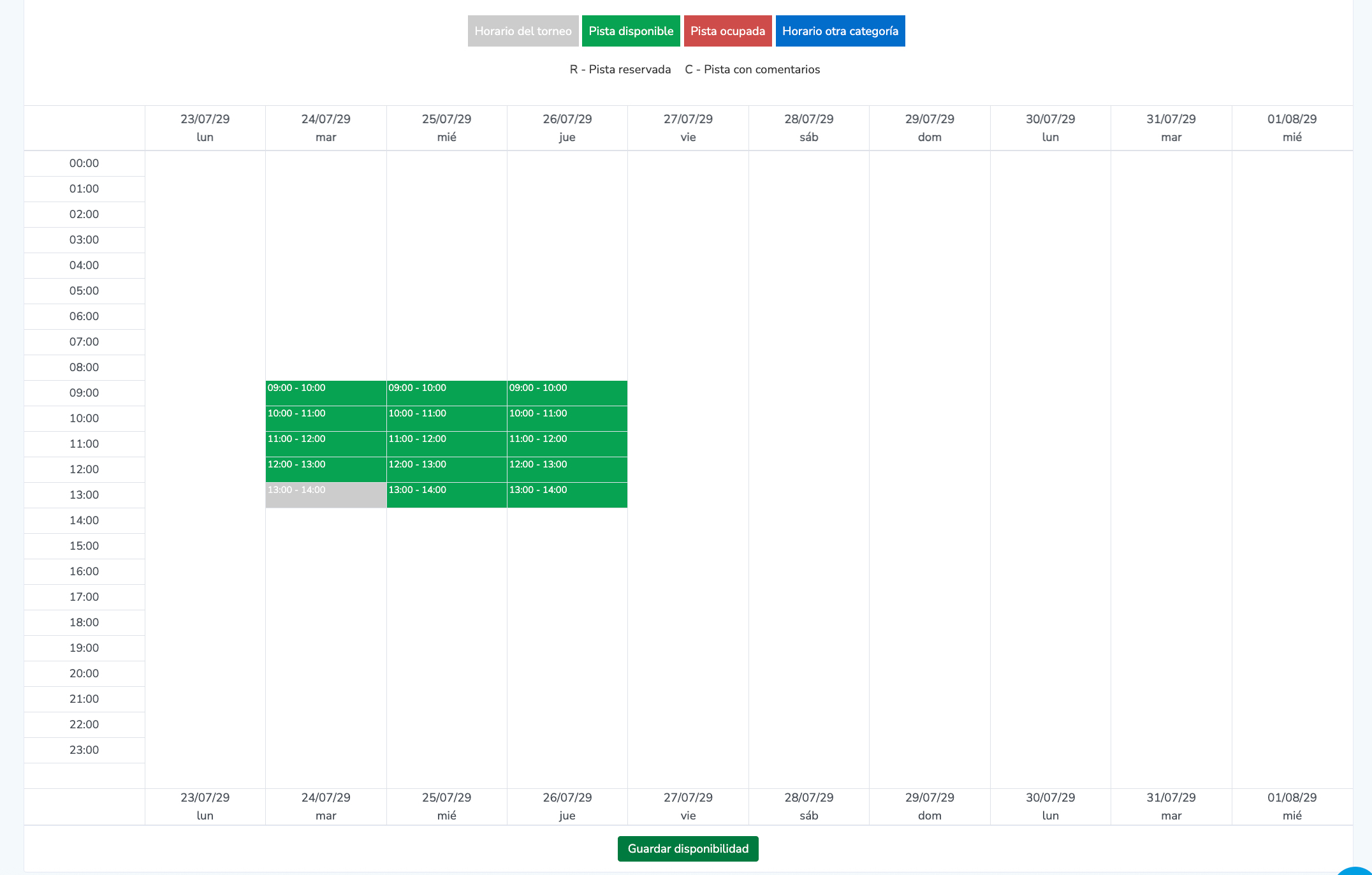 En Disponibilidad de pista, marcarías disponibles solo las horas de 09:00, 10:00, 11:00 y 12:00, dejando sin marcar el lunes a las 13:00.