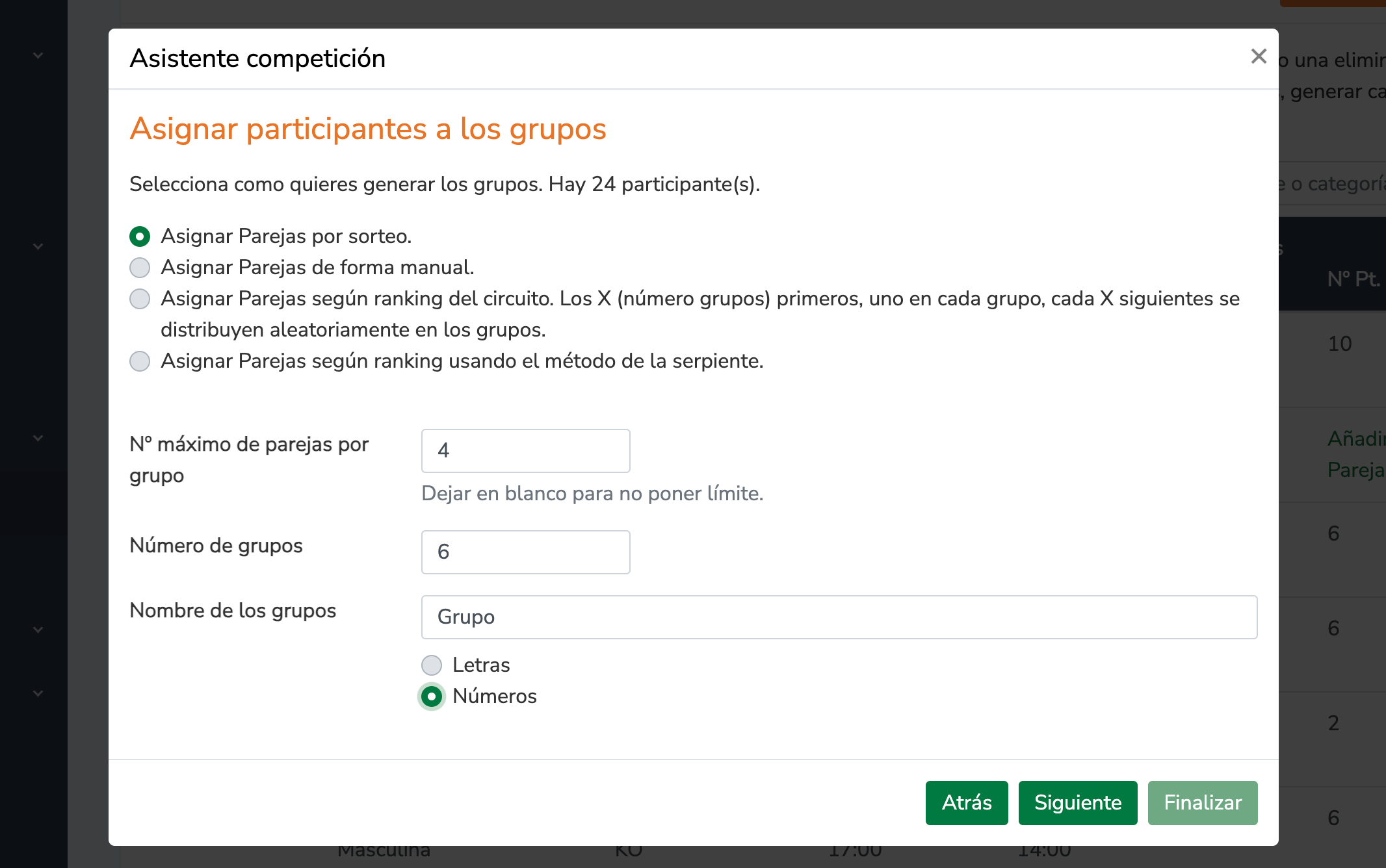 Las parejas se asignan aleatoriamente a los grupos mediante un sorteo. Puedes seleccionar cabezas de serie de forma opcional.