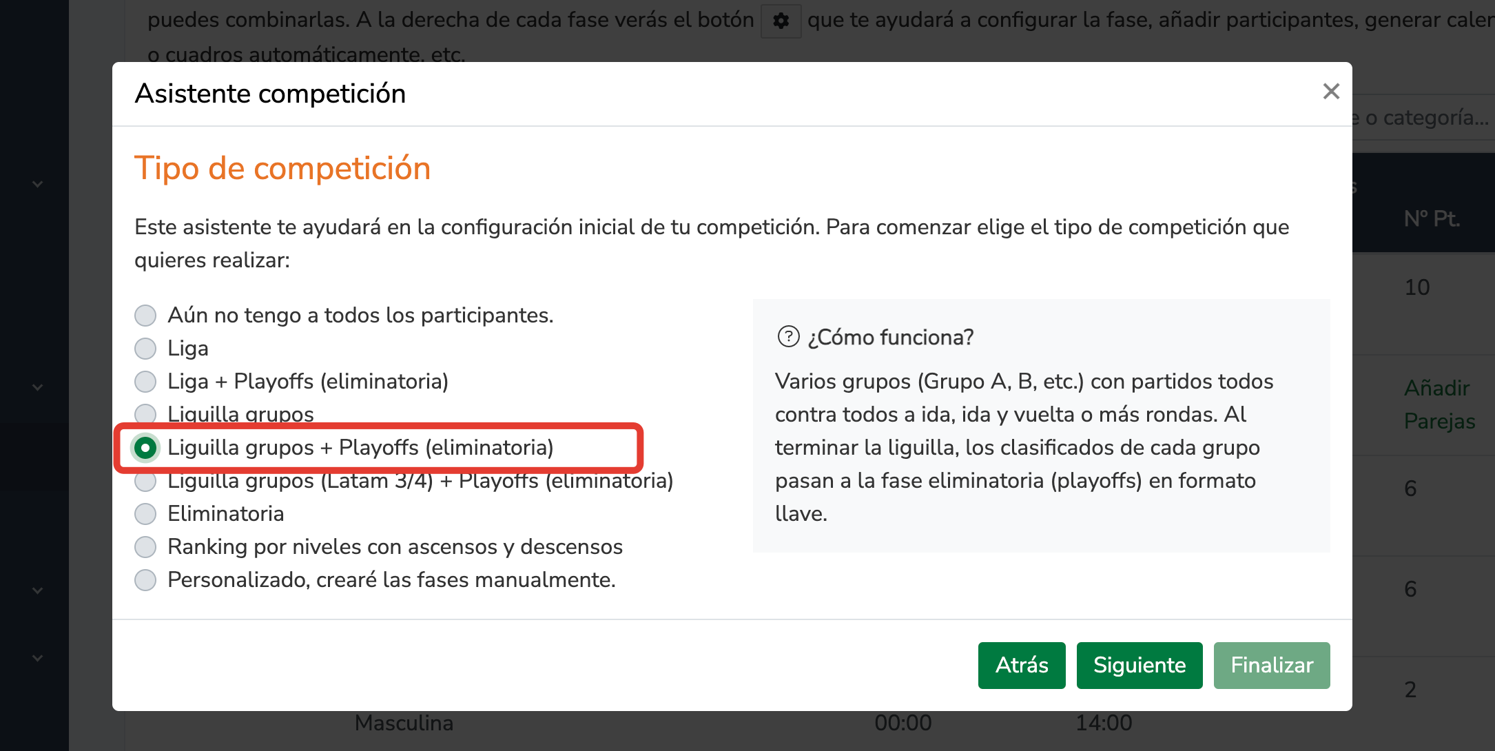 Selecciona el tipo de competición: Liguilla grupos + Playoffs (eliminatoria) y haz clic en el botón Siguiente.