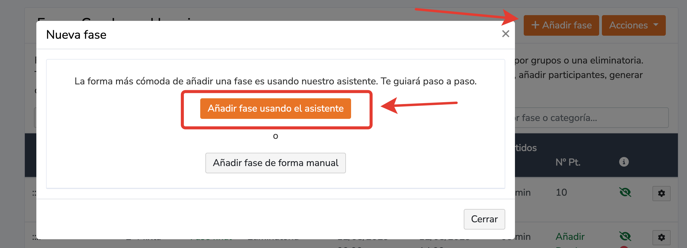 Para generar el calendario de partidos con el formato liguilla por grupos más play off, accede al Panel de Administración de la competición -> en el menú a la izquierda haz clic en Fases y cuadros - > haz clic en el botón +Añadir Fase y posteriormente en el botón Añadir fase usando el asistente