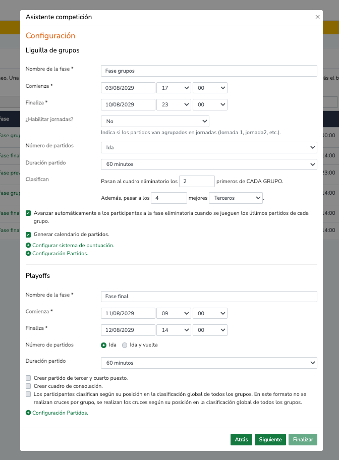 Y por último, configuramos los datos de ambas fases: la fase de liguilla de grupos y la fase de Playoff: