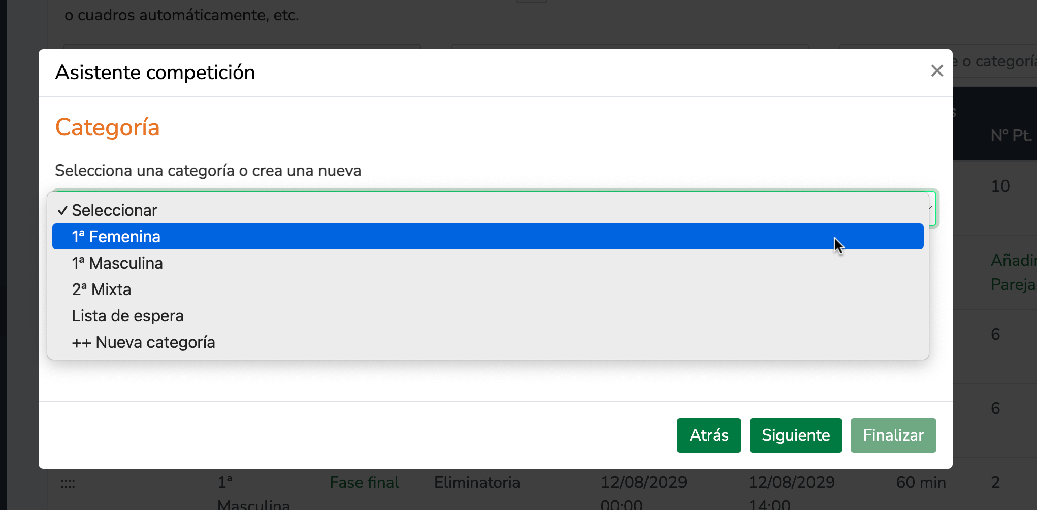 En la siguiente pantalla selecciona la categoría para la que quieres crear los calendarios y haz clic en el botón Siguiente