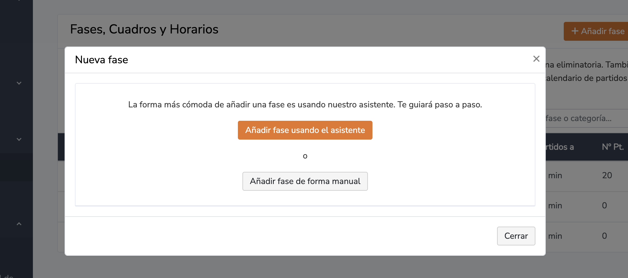 Personalizado (fases manuales) - Añade manualmente las fases de la competición. Si ya conoces la plataforma o quieres tener un control más personalizado.