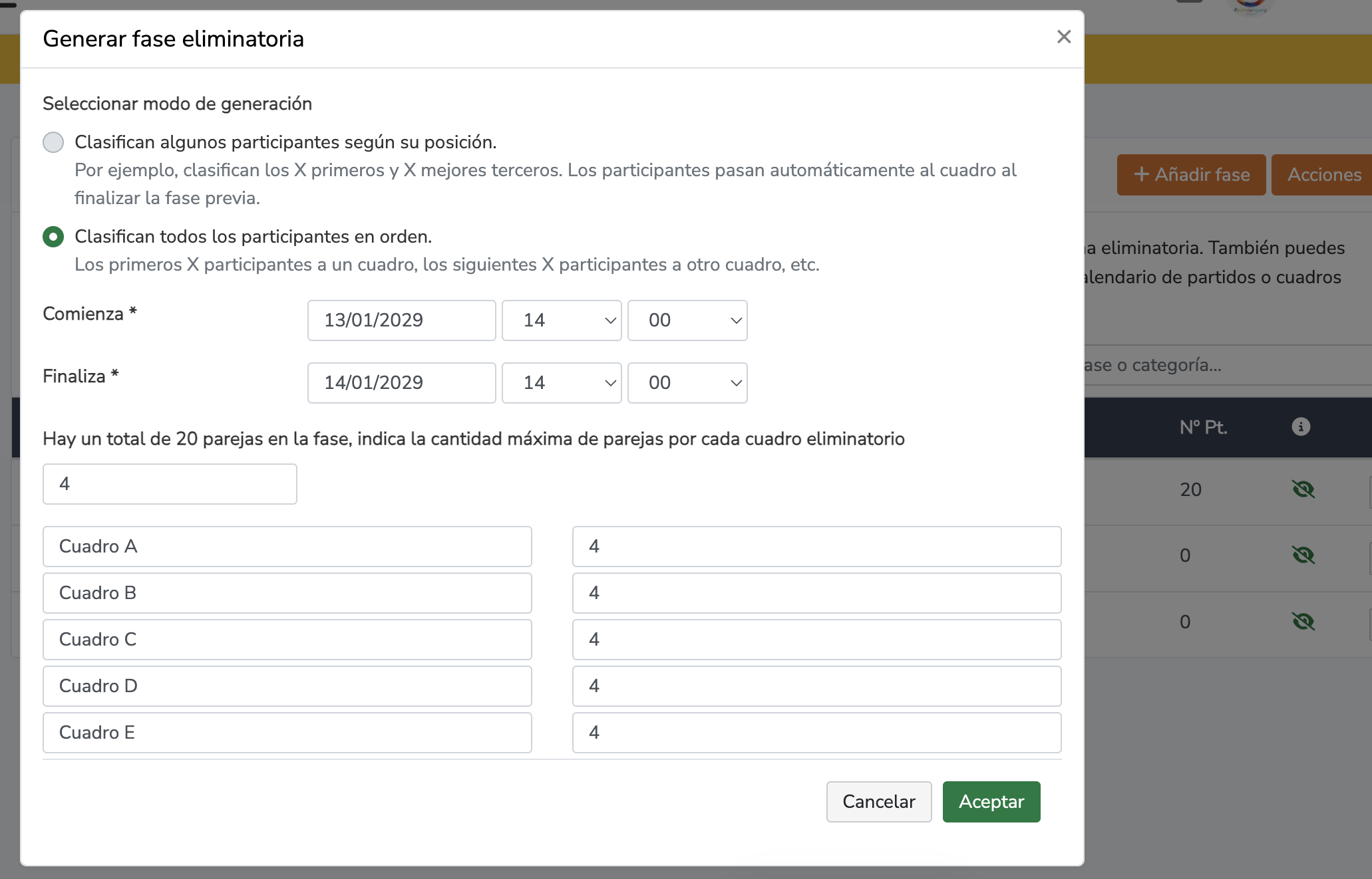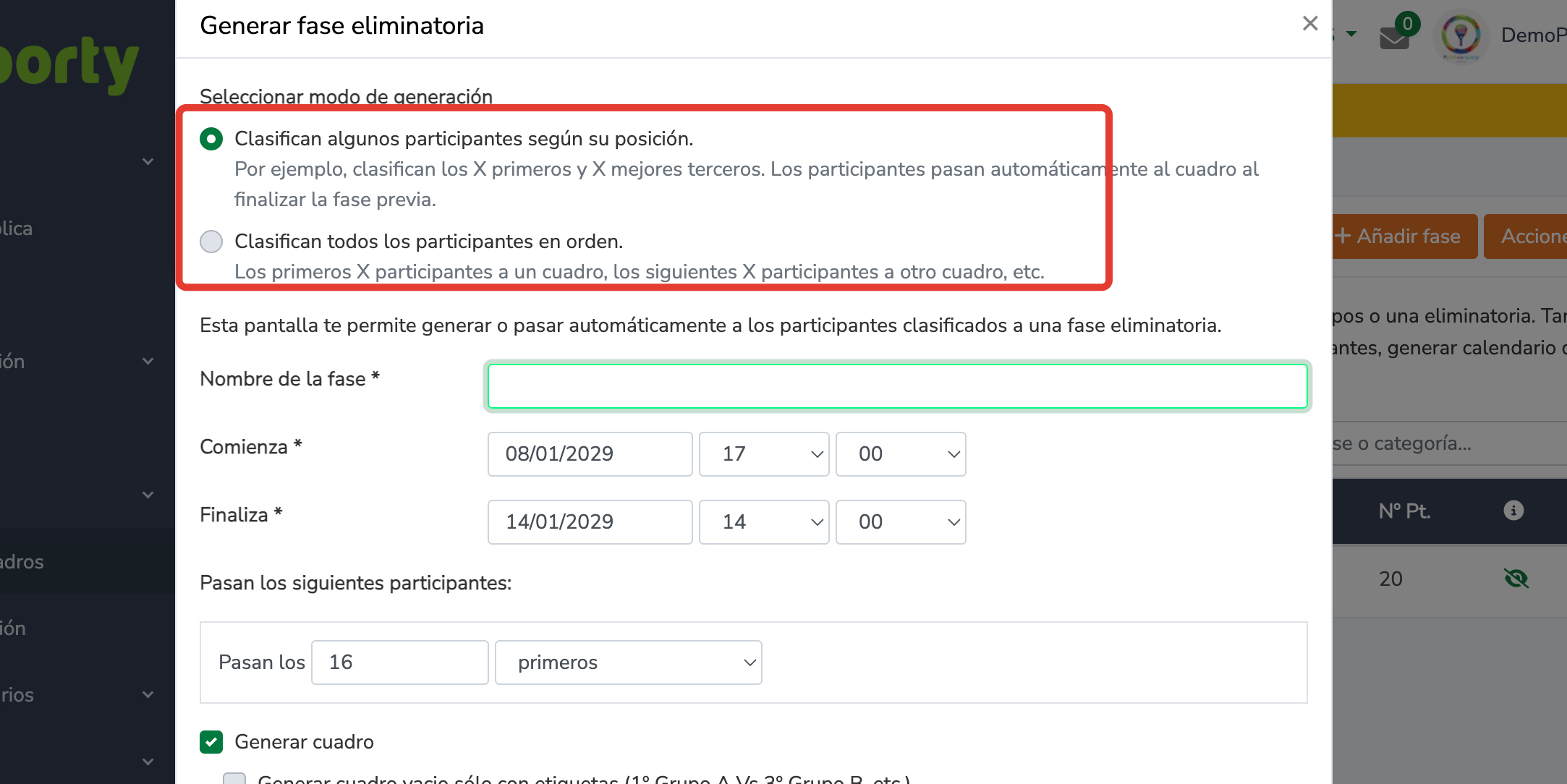 Fase eliminatoria: selecciona una fase ya existente o genera una nueva.